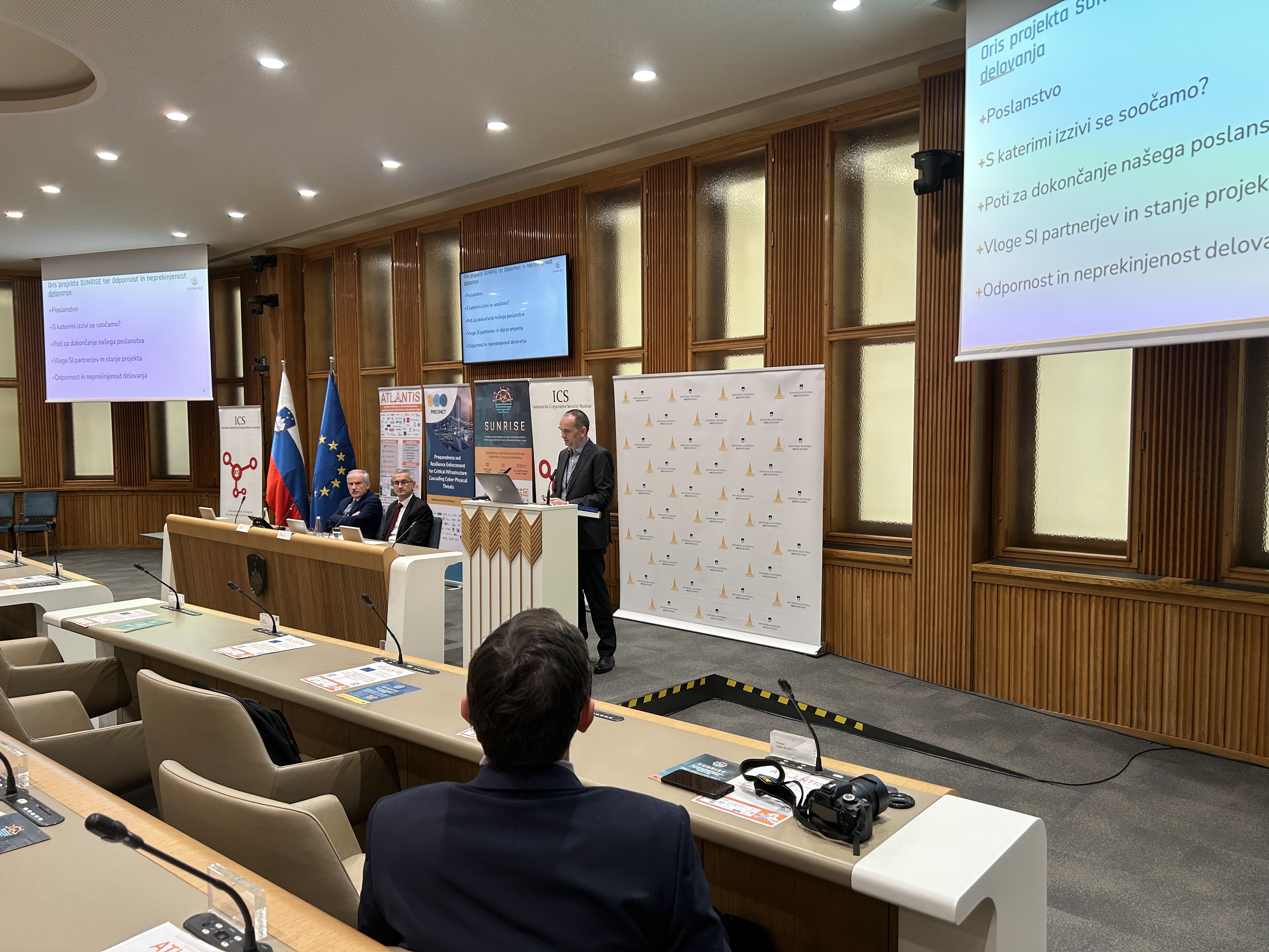 On November 27, 2023, the State Council of the Republic of Slovenia held a national consultation entitled "Resilience and business continuity of key organizations - an imperative of modern society" in the co-organization of the State Council, the Institute for Corporate Security Studies (ICS) and the Slovenian Association for Corporate Security. At the national conference, we had the opportunity to present the SUNRISE project, through an extremely interesting presentation, which was presented by Milan TARMAN PhD, from the Institute for Corporative Security Studies. An outline of the SUNRISE, the mission of the project, the challenges faced and the pathways to solutions, the roles of the Slovenian partners and the status of the project were presented.